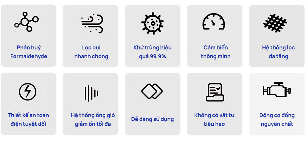 - Công nghệ lọc khí tiên tiến hàng đầu: Hệ thống lọc đa tầng kết hợp công nghệ tĩnh điện hoàn nguyên tiên tiến, loại bỏ hoàn toàn bụi mịn, vi khuẩn, virus, nấm mốc và các chất ô nhiễm khác, mang đến bầu không khí trong lành và an toàn tuyệt đối.